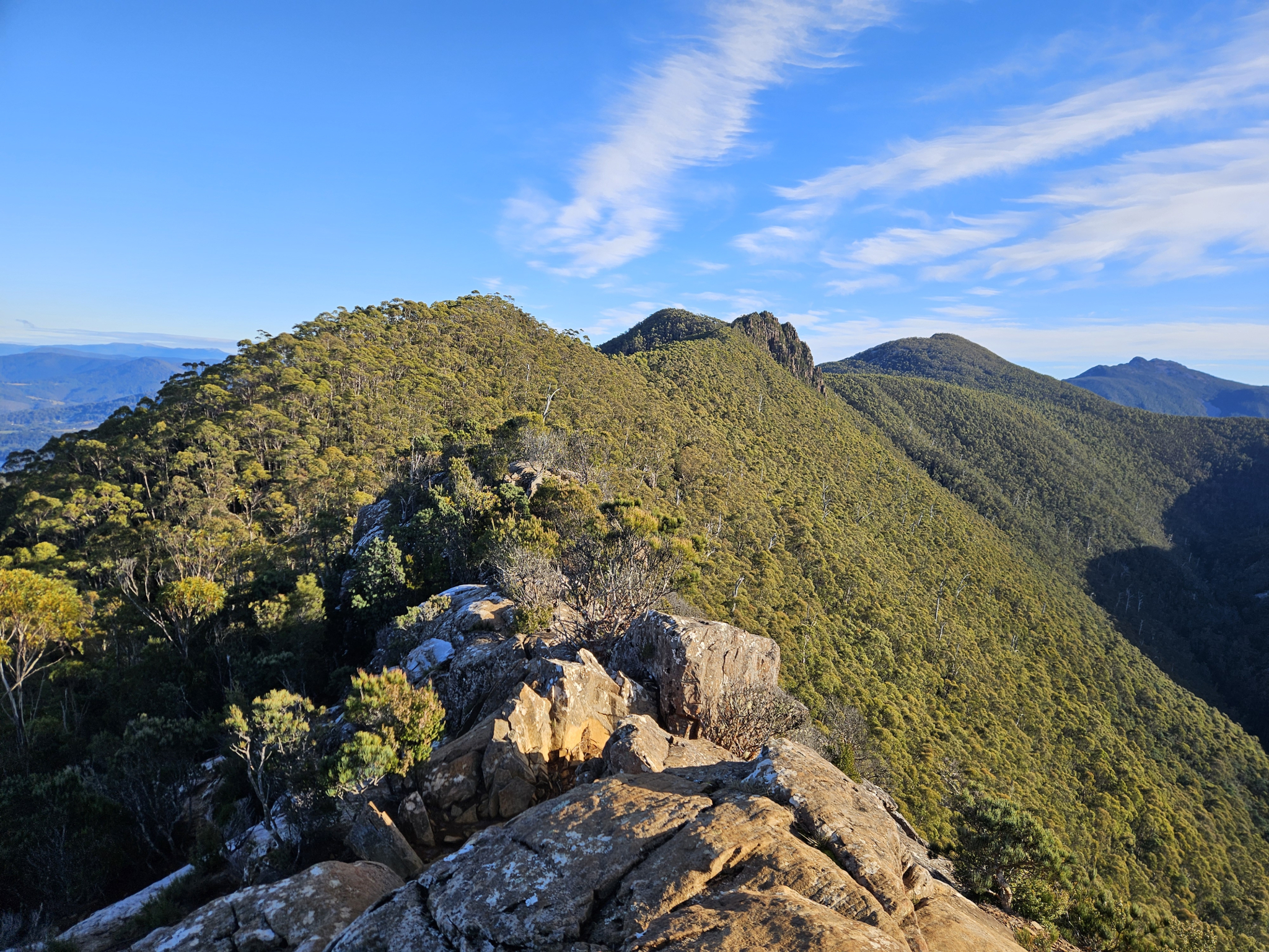 Once you are at the top of Cathedral Rock, there are several lookout points with excellent views out to Storm Bay, the Wellington Range and the D’Entrecasteaux Channel. Perhaps the most impressive viewpoint is out across the Montagu Thumbs, the ridgeline behind Cathedral Rock.