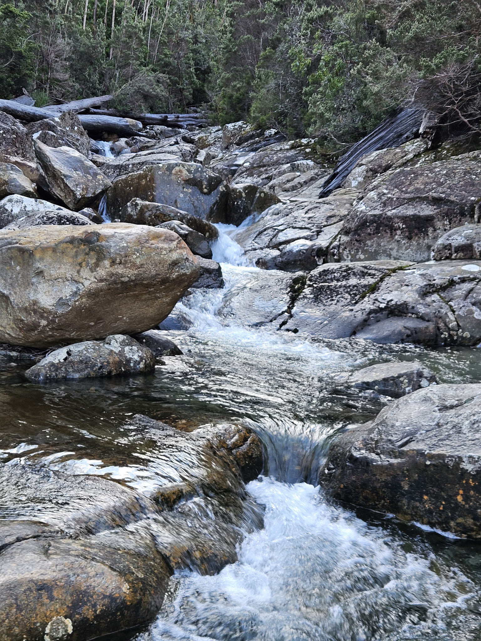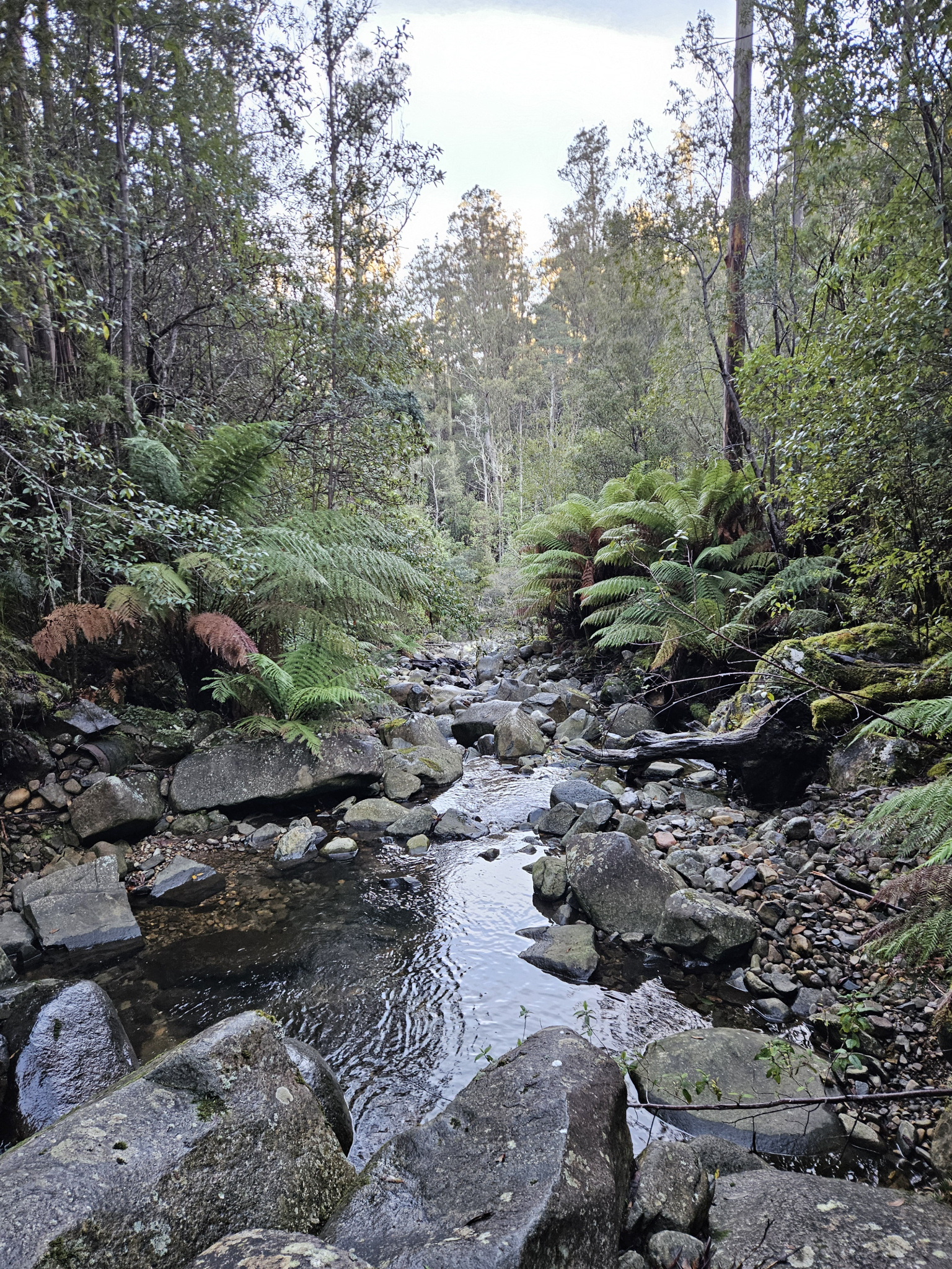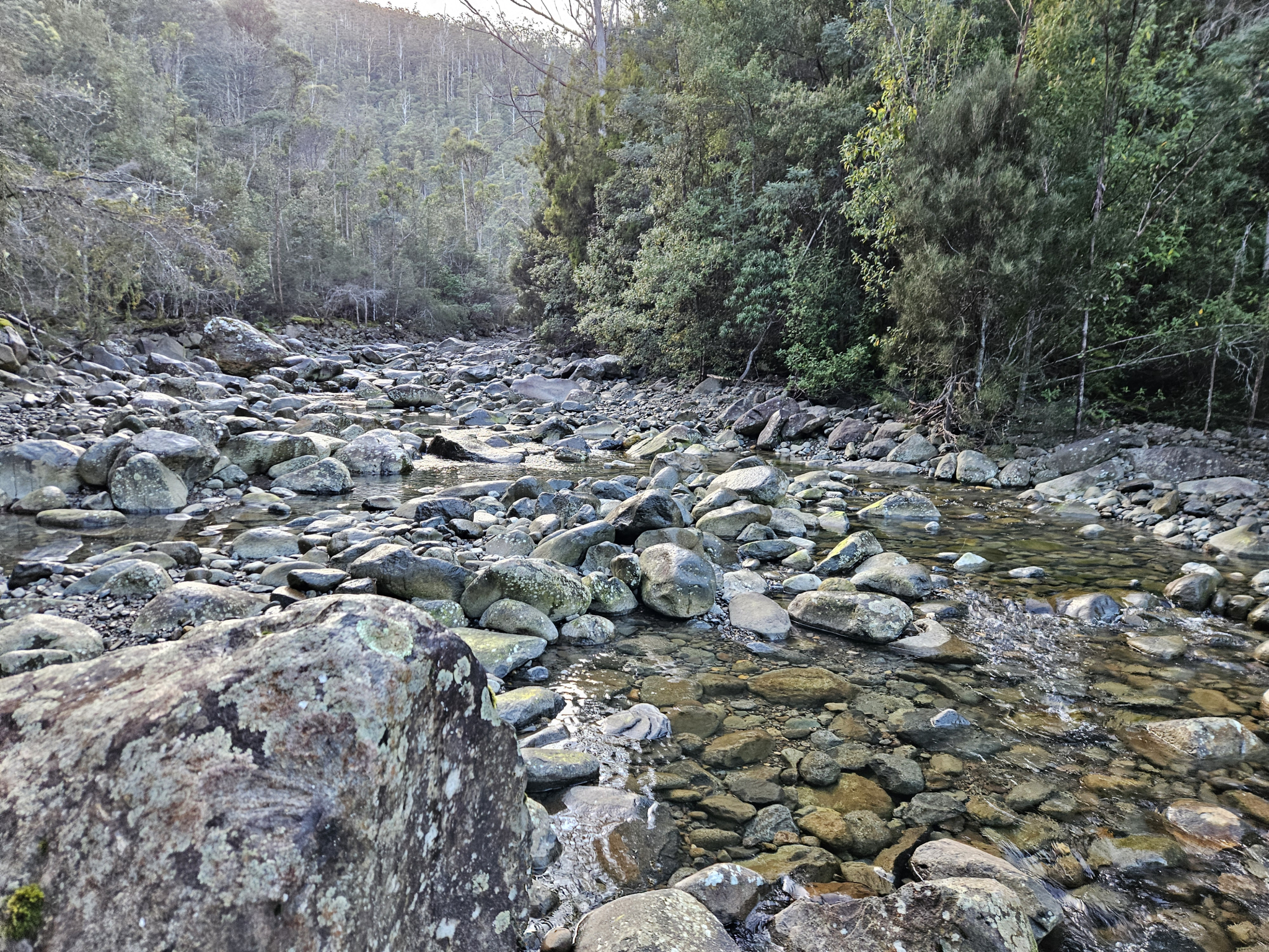 At the bottom of the steepest part of the syphon track, you will meet Plains Rivulet. Hop across the rocks and continue to the trail on the other side.