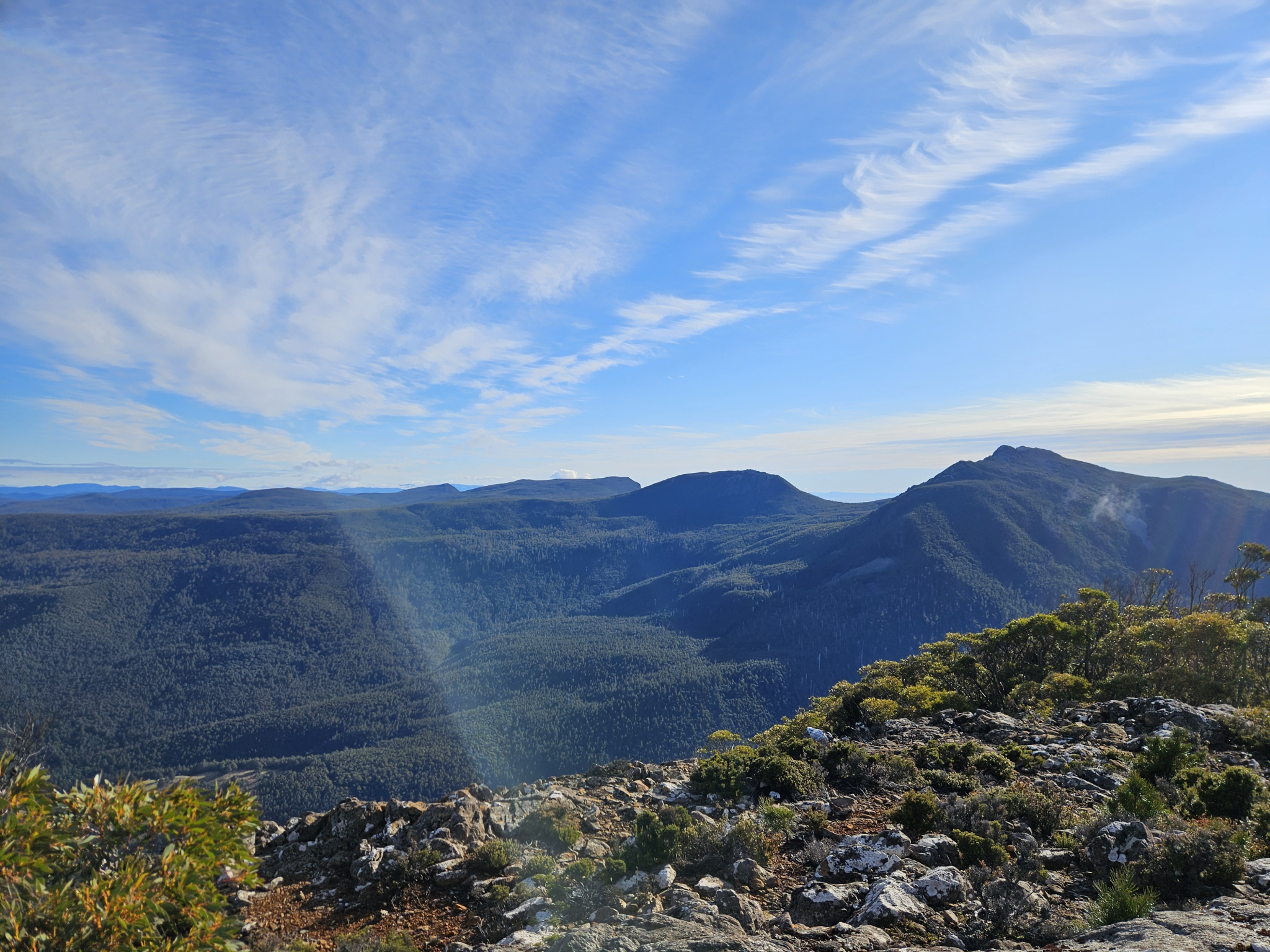 As you make your way along the ridgeline, you will travel mostly through light woodlands, with a few scrambling sections where you'll need both hands free to move across. The flora along the ridgeline consists of a range of sub-alpine species, including Tasmanian Snow Gum (Eucalyptus coccifera), Alpine Yellow Gum (Eucalyptus subcrenulata), Richea dracophylla and Mountain Pinkberries (Leptecophylla parvifolia).