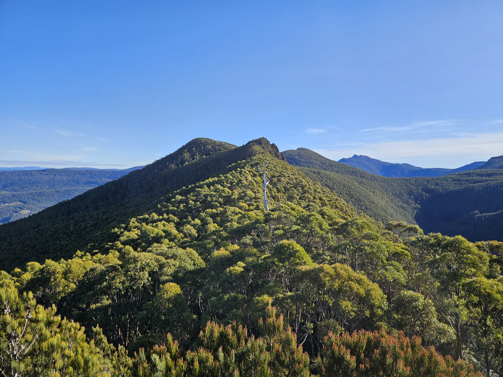 After leaving Cathedral Rock to continue over the Thumbs, head a few metres back the way you came down the southern side of the rock, and there is a trail that continues along the southern side of the Ridge line. Do not attempt to follow the very top of the Ridge line here, as there is a drop-off after a short distance.
