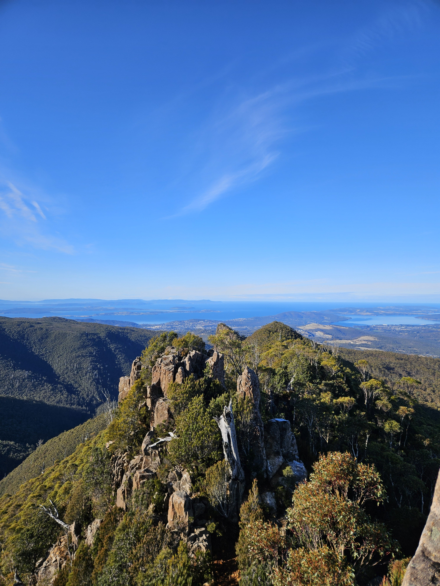 Once you are at the peak, on a clear day you will be rewarded with stunning 360 degree views out to Fluted Cape on Bruny Island, the Tasman Peninsula, Sleeping Beauty and the rest of the Wellington Range, and an excellent view of the Huon Valley and the mountains of the South-West behind it. This point is an excellent spot for lunch, especially on a sunny day.