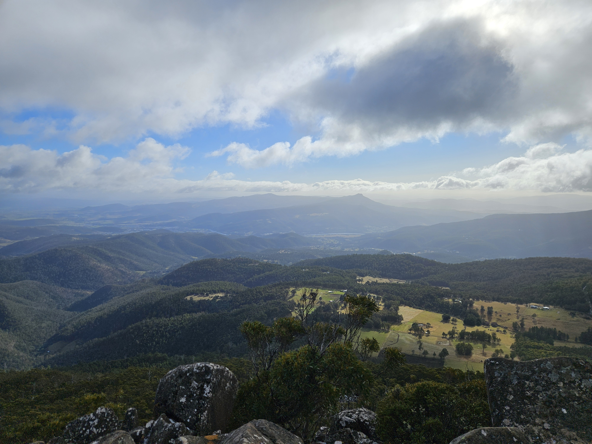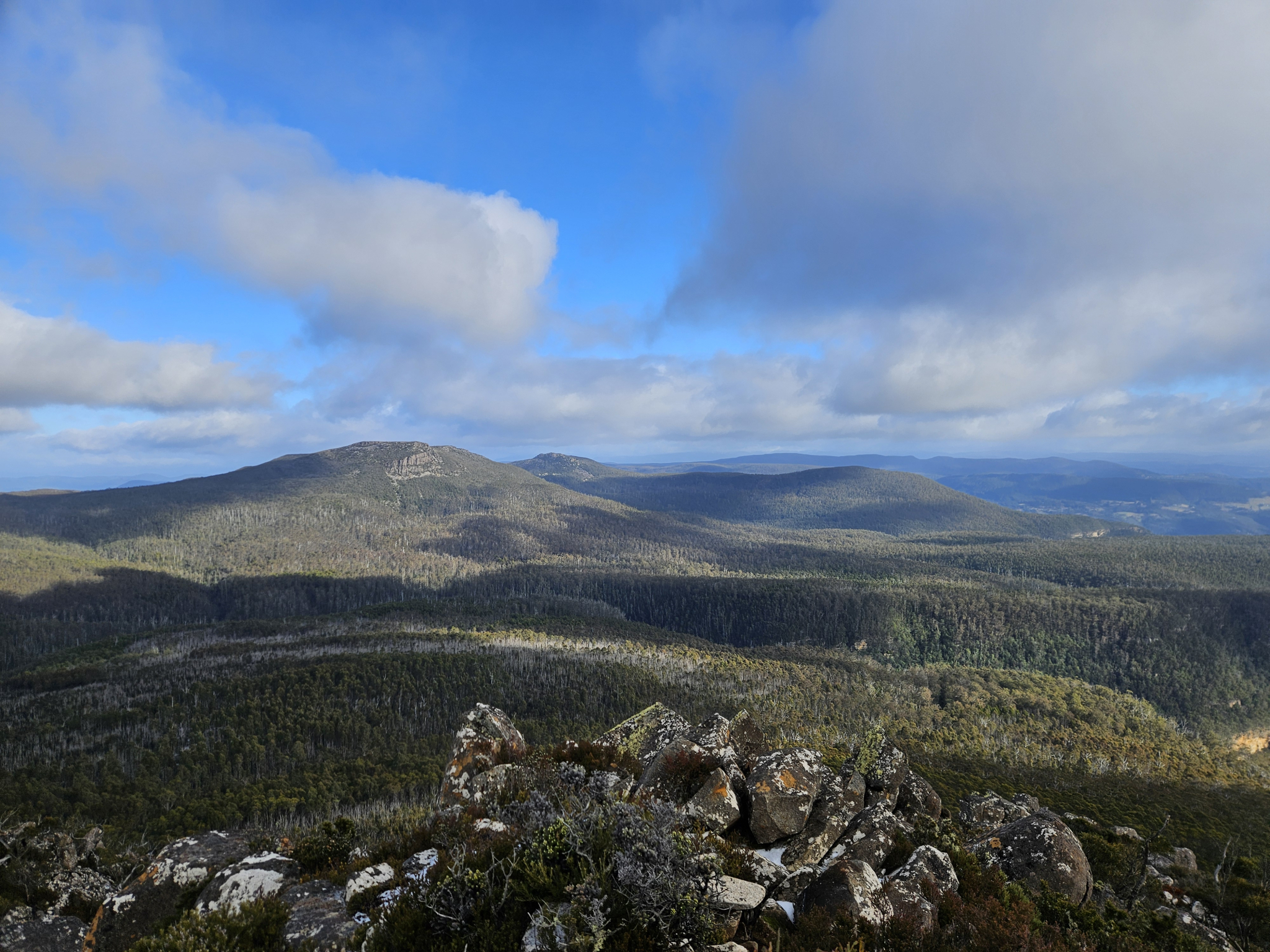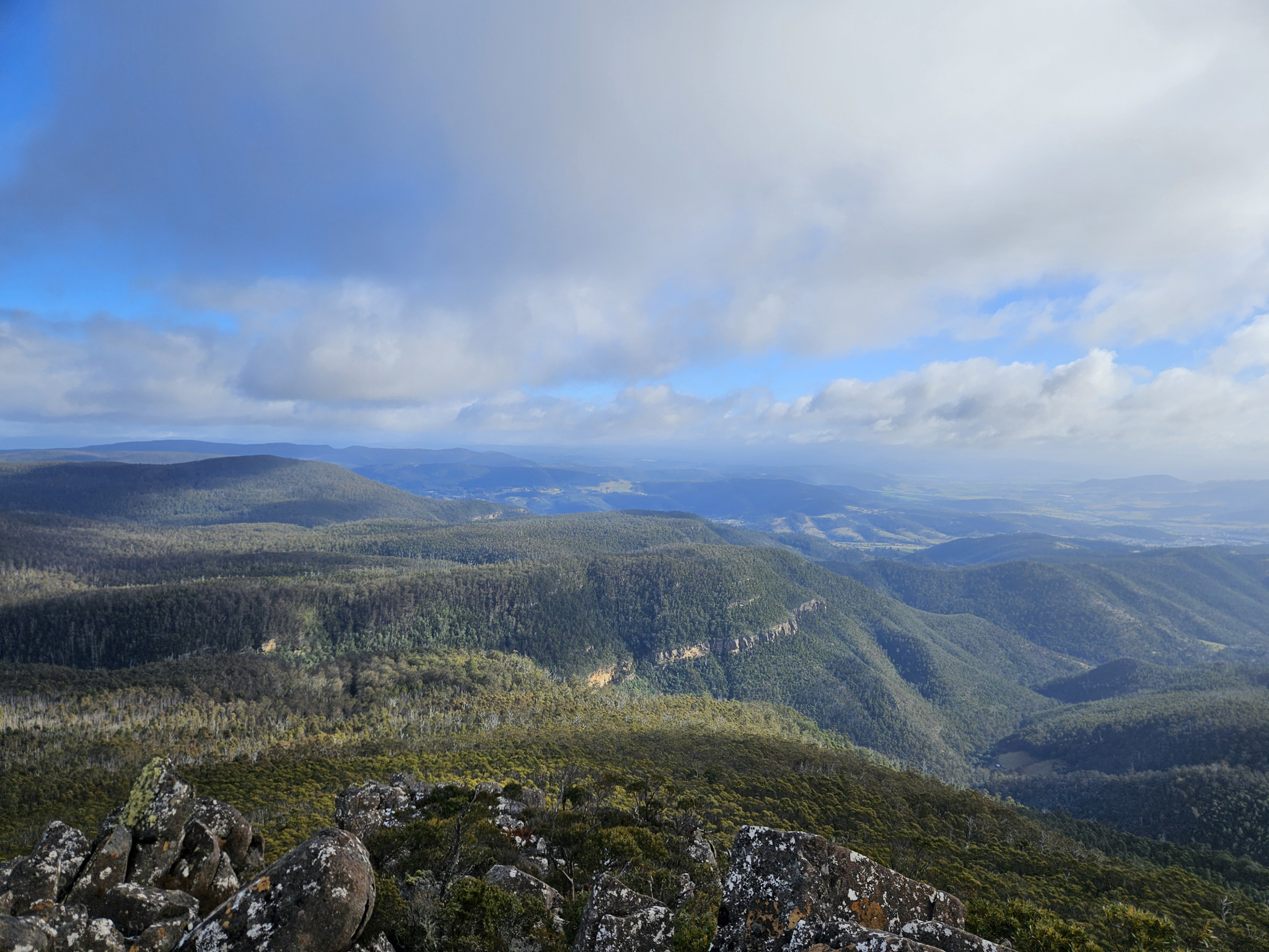 Awesome views from Collins Cap in all directions, especially northward towards the Derwent Valley. Another highlight is the cool temperate rainforest flora lining the track close to the creek on the way up, including Myrtle beech (Nothofagus cunninghamii), Sassafras (Atherosperma moschatum) and tree ferns (Dicksonia antarctica), amongst other species. Eucalyptus regnans, the worlds tallest flowering plant, are also present along the trail.