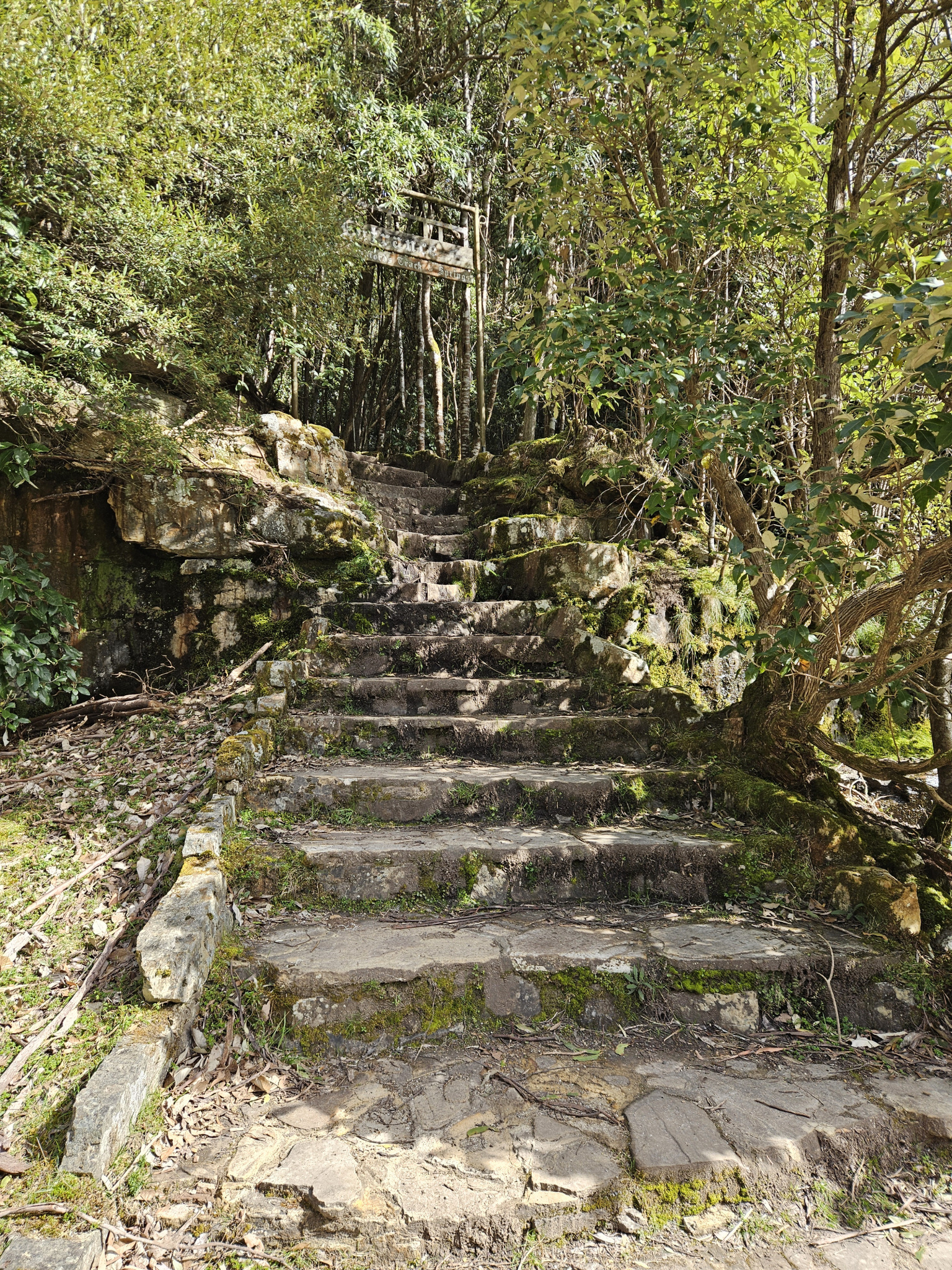 The trail continues to wind its way up the hill on a well-made track, with regular stone steps. By this stage you will no longer be following the creek. After walking around 1km, you will reach the Radford track intersection. To continue on to the end of the Fern Glade track and to Rocky Whelan's cave, continue straight ahead. From here, the Fern Glade track becomes mixed use, so keep an eye out for cyclists. After this point the track becomes wider and more level, and the forest type soon changes to dry eucalyptus forest.