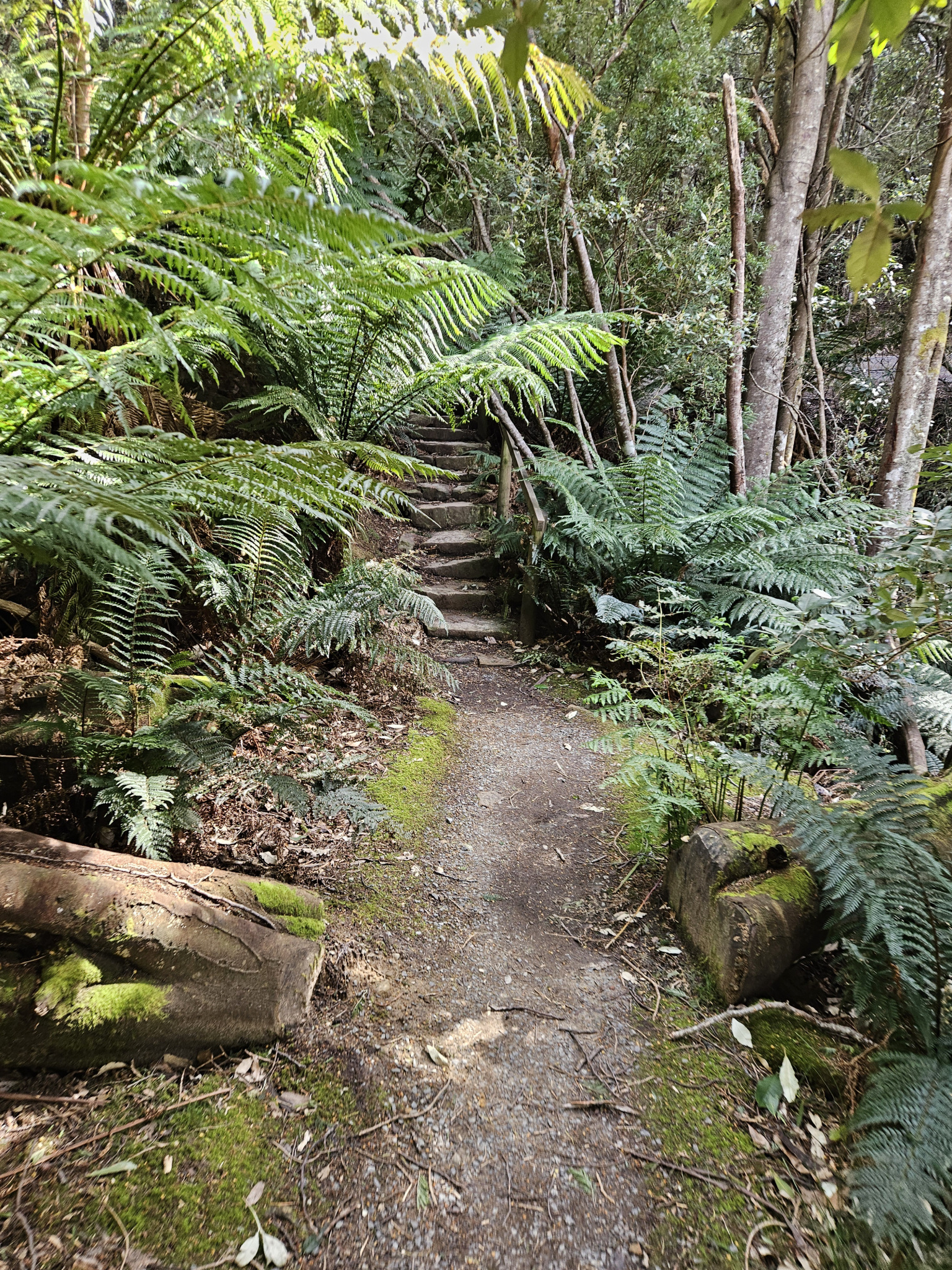 The forest around you is a mixture of wet forest and sclerophyl species, with plenty of ferns and moss. After walking around 570m, you will make your way up some stairs and cross the resevoir trail, to where the Fern glade track continues.