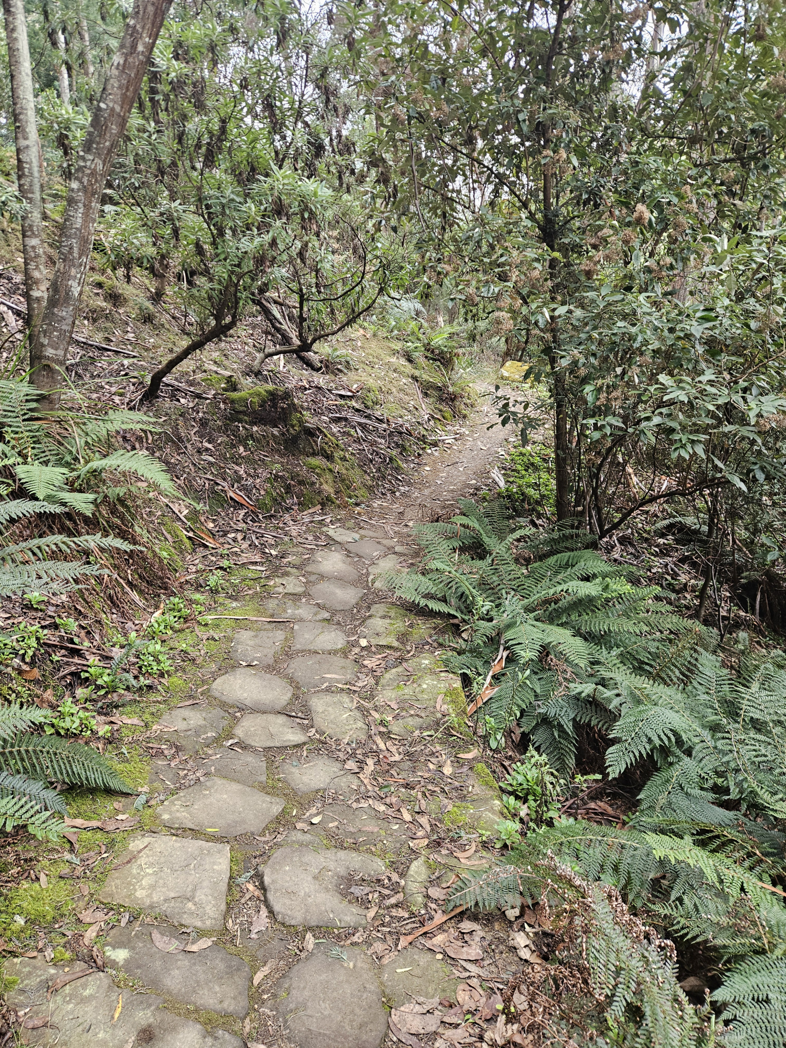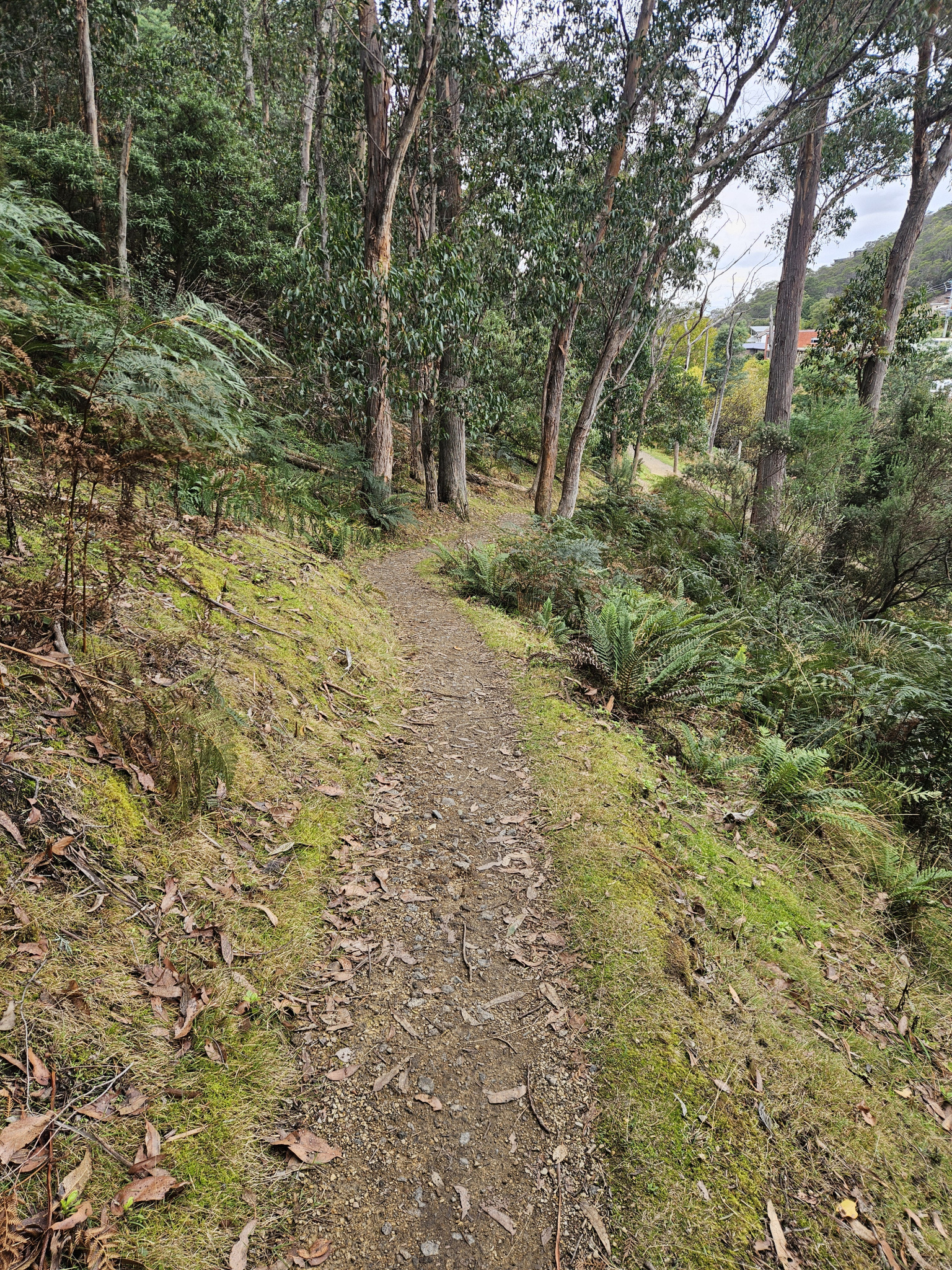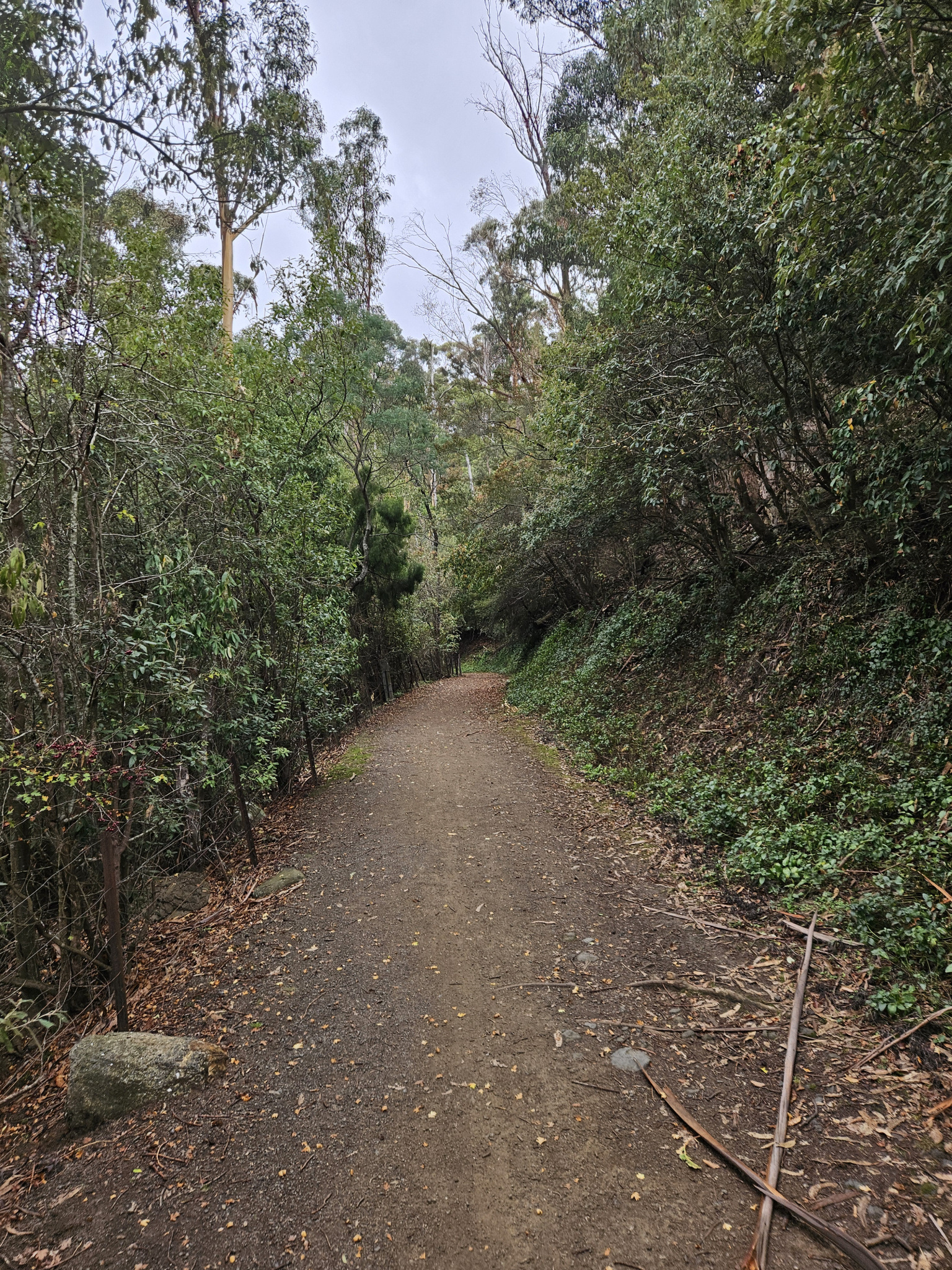 Starting the trail on the right hand side of Romilly Road, make your way past the signs and continue on to the track. The first 1km of the trail is quite flat, and weaves its way along the side of the hill, with views down into Sandy bay rivulet and over to the houses backing onto it along Waterworks Road.