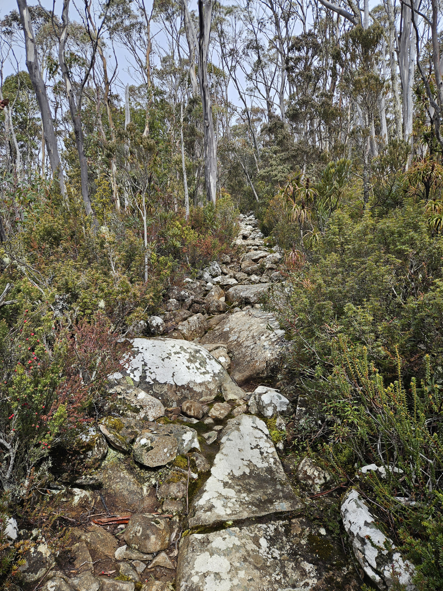 Gradually, the forest will begin to thin out as it becomes predominantly sub alpine eucalyptus species and small shrubs, which gradually giving way to Dolerite boulders fields.