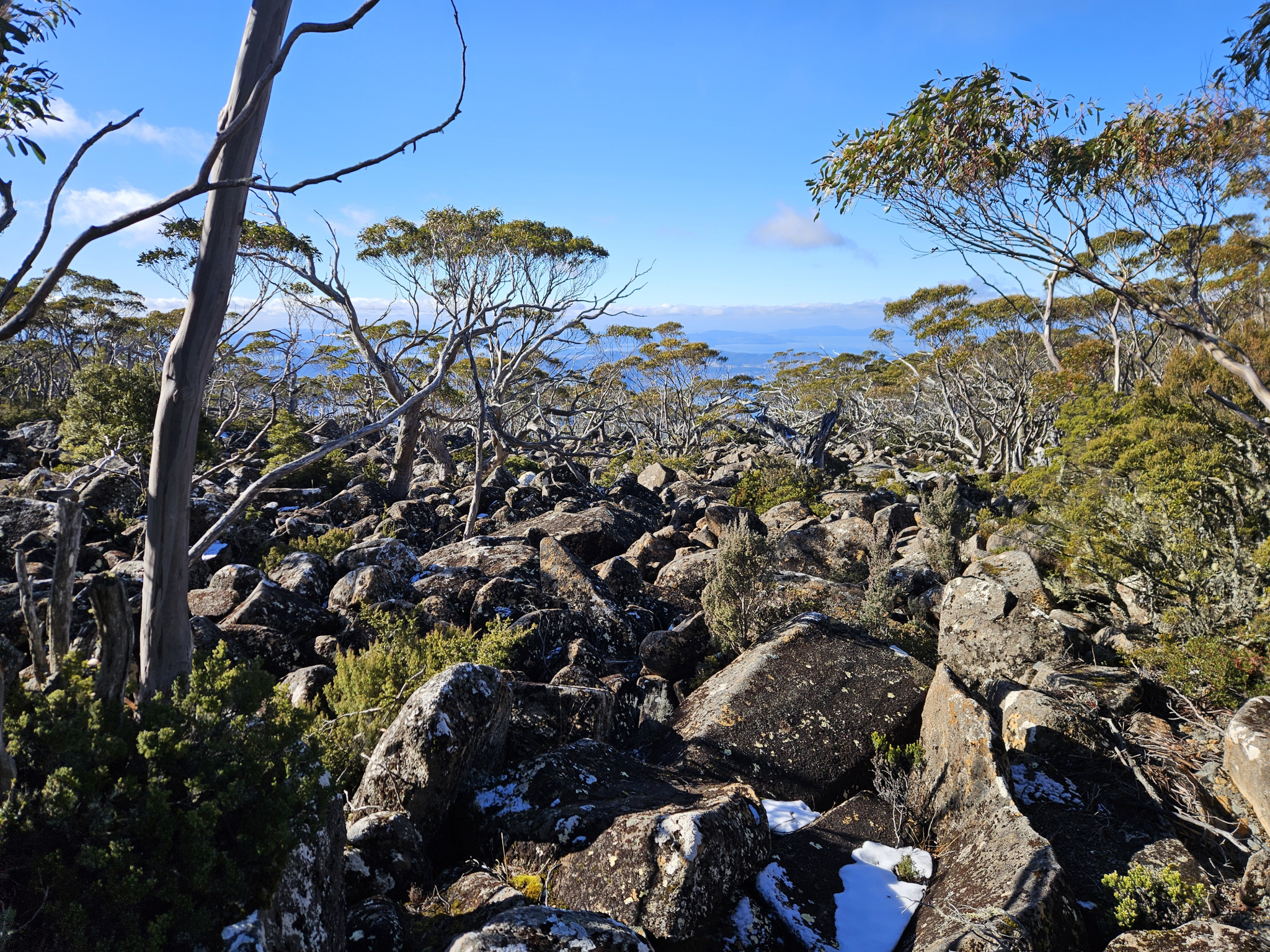At the back of this area are the large cliffs that are visible from Hobart, and there are multiple large rock slabs that make a great spot to sit, enjoy the view and have some lunch. As you explore the area, be careful when crossing between rock slabs, as there are several large crevasses that should be avoided.